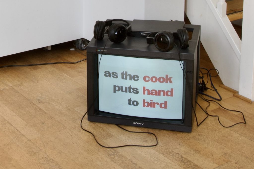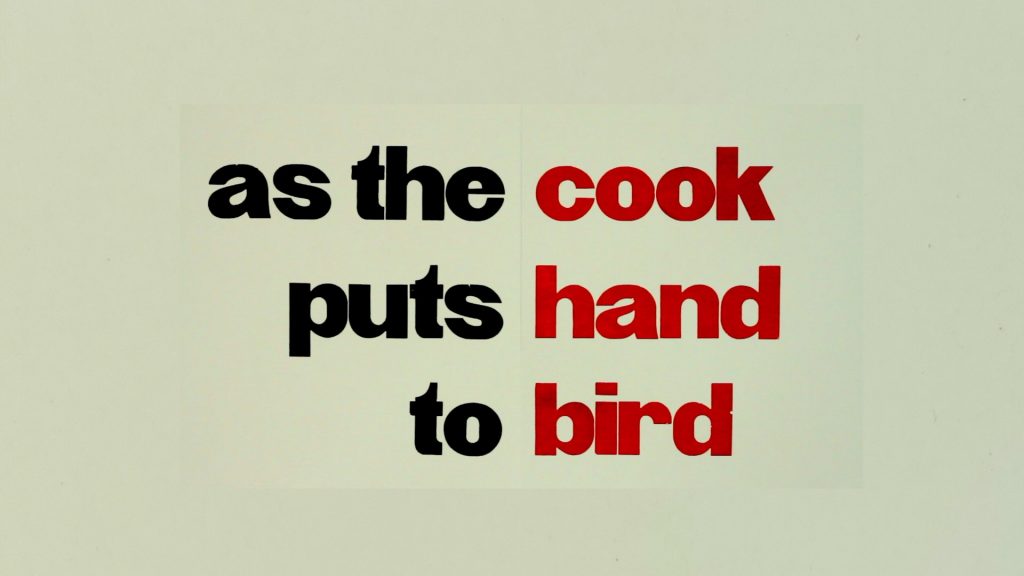 Video, 1’35, 2025.Based on Julia Childs recipe for Poularde à la d’Albufera.Texts hand printed on letter in collaboration with Joos Mooi Drukwerk.